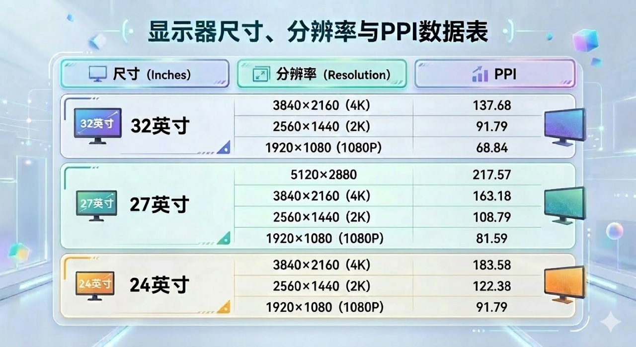 PPI:屏幕像素物理密度,數值越高顯示越細膩。相同分辨率,屏幕尺寸越小PPI越大。相同尺寸,分辨率越高PPI越大。