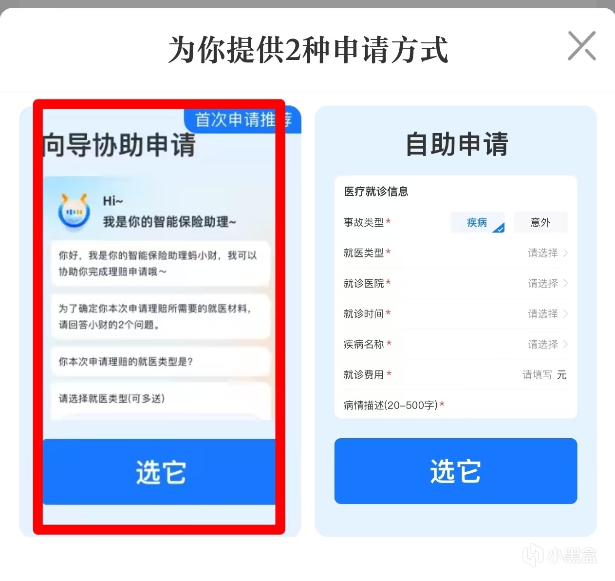 2. 點擊申請理賠,選擇嚮導協助申請(他會詢問在哪家醫院治療,自動獲取電子發票,更省事)