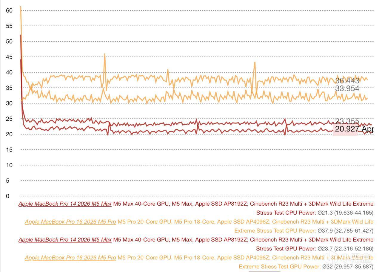 測試數據顯示,M5 Max在MacBook Pro 14上的功耗表現呈現明顯的"斷崖式"下跌: