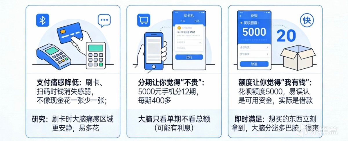 想買的東西,現在就能拿到,不用等攢夠錢。大腦的多巴胺立刻分泌,很爽。