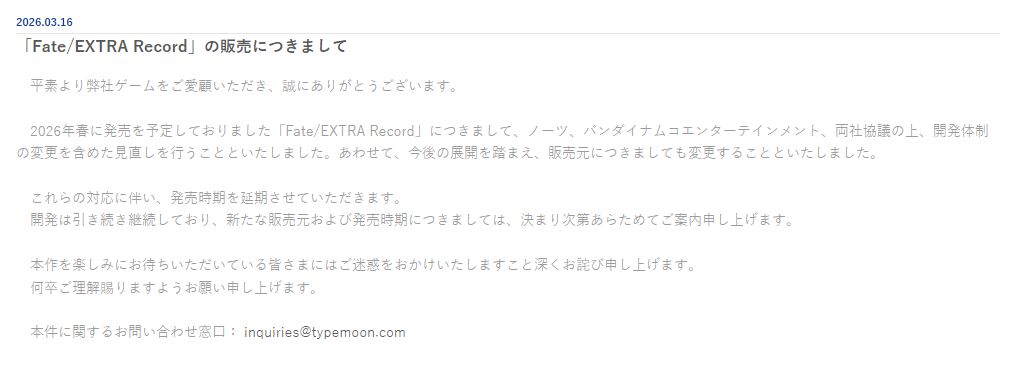 TYPE-MOON官方宣佈,原定於2026年春季發售的《Fate/EXTRA Record》再次延期!