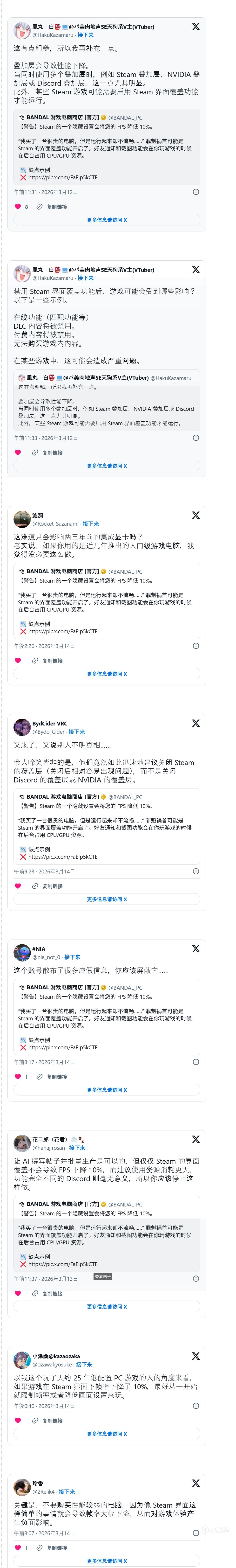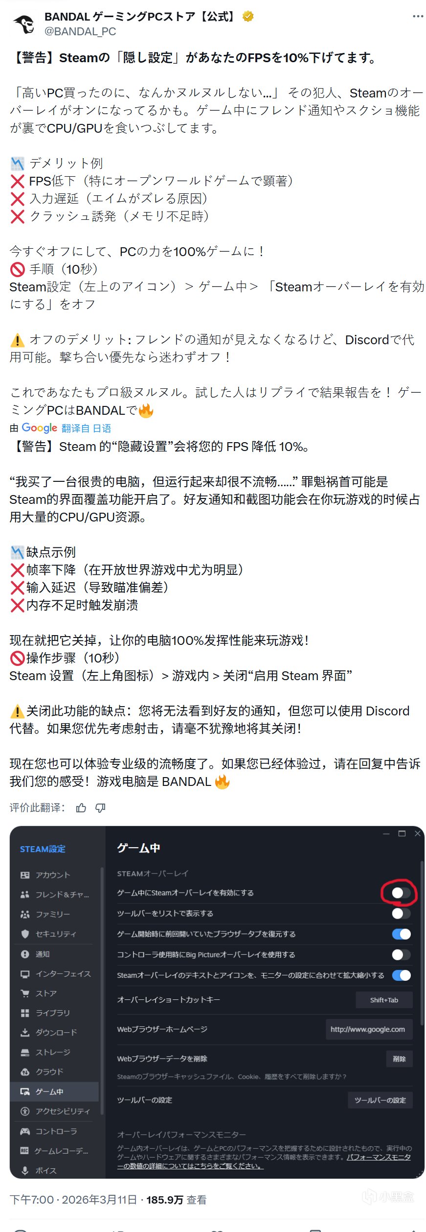 事件起因於 BANDAL 官方賬號試圖向用戶提供“優化遊戲表現”的祕籍,但其核心觀點——即 Steam 界面佔用資源巨大——顯然低估了現代硬件的性能以及 Steam 近年來的架構優化。大量網友在評論區曬出實測數據反駁,指出在當今主流的 32GB 內存及高性能 GPU 環境下,內置界面的性能損耗幾乎可以忽略不計,通常波動在 1% 以內,遠達不到所謂的 10%。