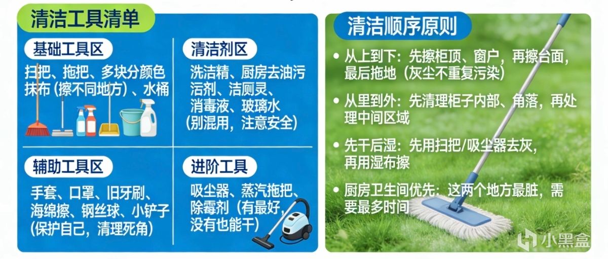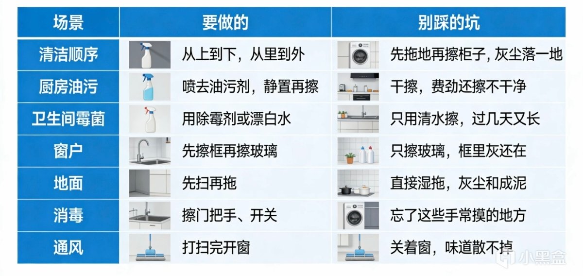 從上到下:先擦櫃頂、窗戶,再擦檯面,最後拖地。灰塵不會重複污染。