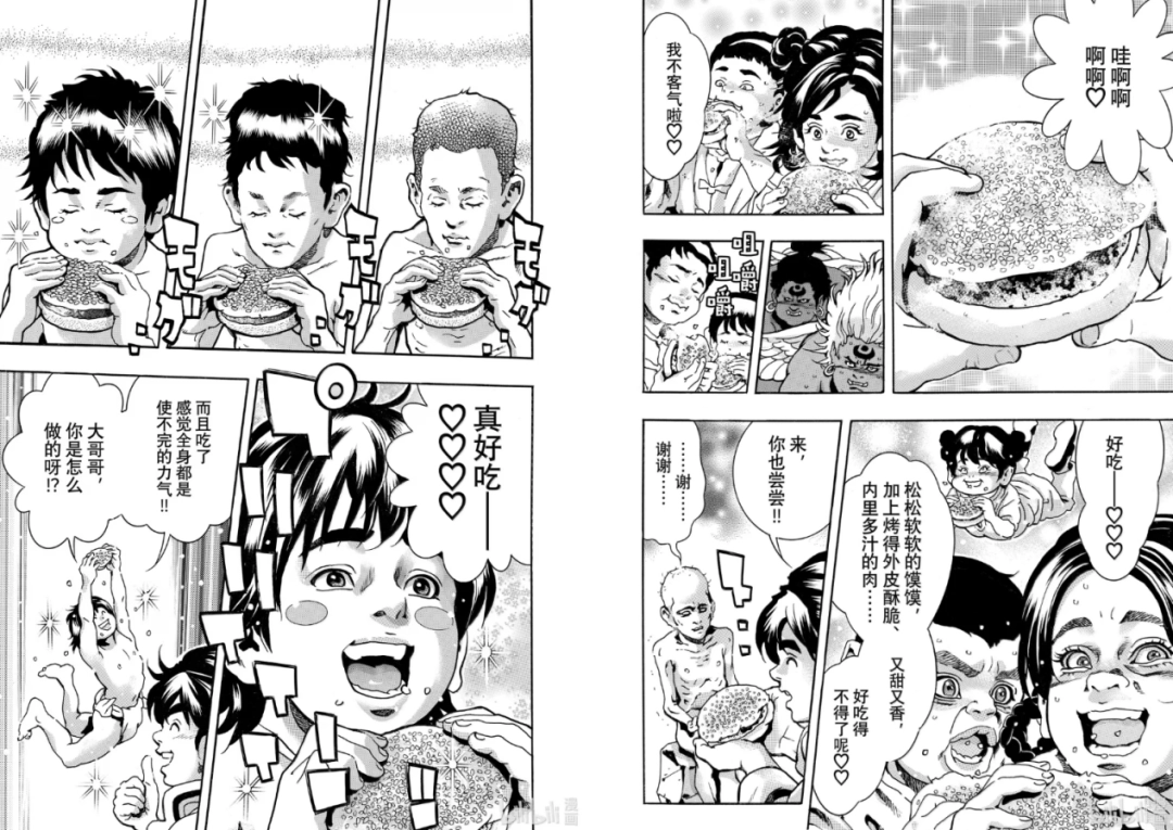 如果你覺得劉昴星秒搭石塔的活已經夠狠,那不妨再看看料理本身的功效:一位餓得骨瘦如柴的小孩對着漢堡一口下去,直接從骷髏兵變回人形,渾身有使不完的力氣。只能說,常熟阿諾的九龍之力,都比不上這漢堡一根。