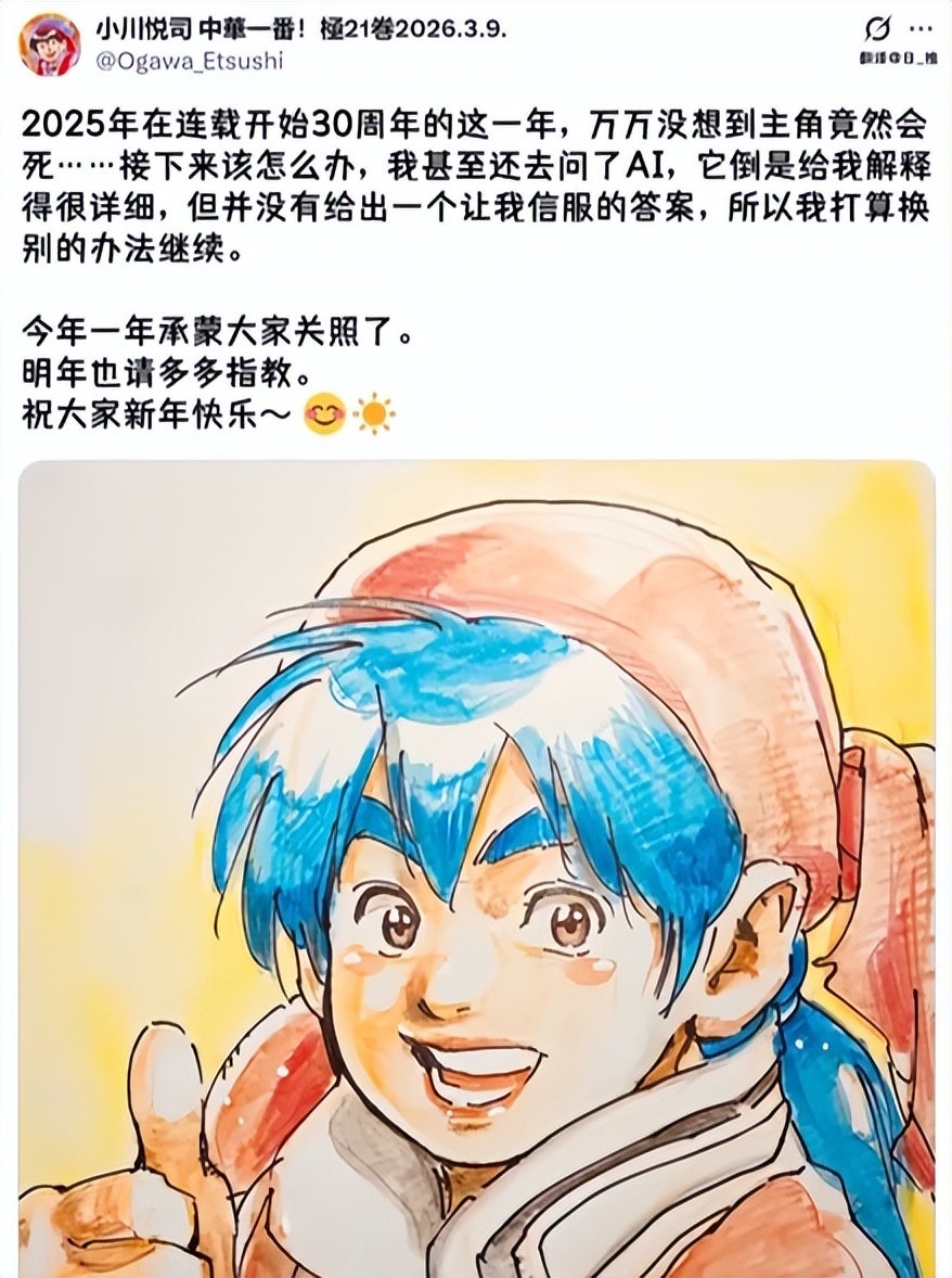 再加上原作者小川悅司在去年年末時,曾發文表示劉昴星死後,自己都不知道該如何續寫劇情,甚至曾打算參考AI的意見,就顯得整件事情更加離譜了。