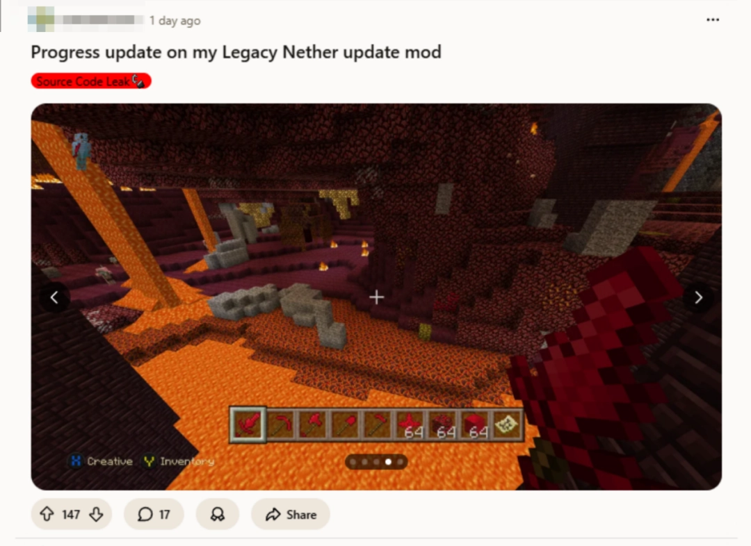 既然泄露源碼的版本老舊,那就爲它加入各種各樣的新版本內容,將官方的新版本反向移植回這個原主機版中——如今,已經有人直接用上新版本的素材,還原下界更新的內容,更新速度疑似比《我的世界》官方還快。