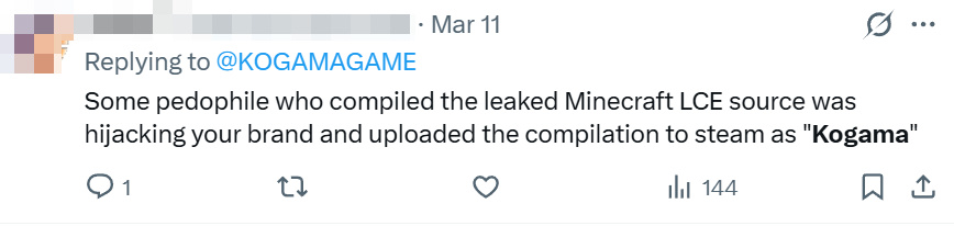 所謂的社區版,好歹能扯上幾句有關原主機版與基岩版的恩恩怨怨,可《Kogama》,就只是這位網絡巨魔藉着源代碼泄露的東風,在互聯網上譁衆取寵罷了,到最後還是鬧麻了——把整起事件的水給攪渾了不說,又給網友們留下了一堆樂子。