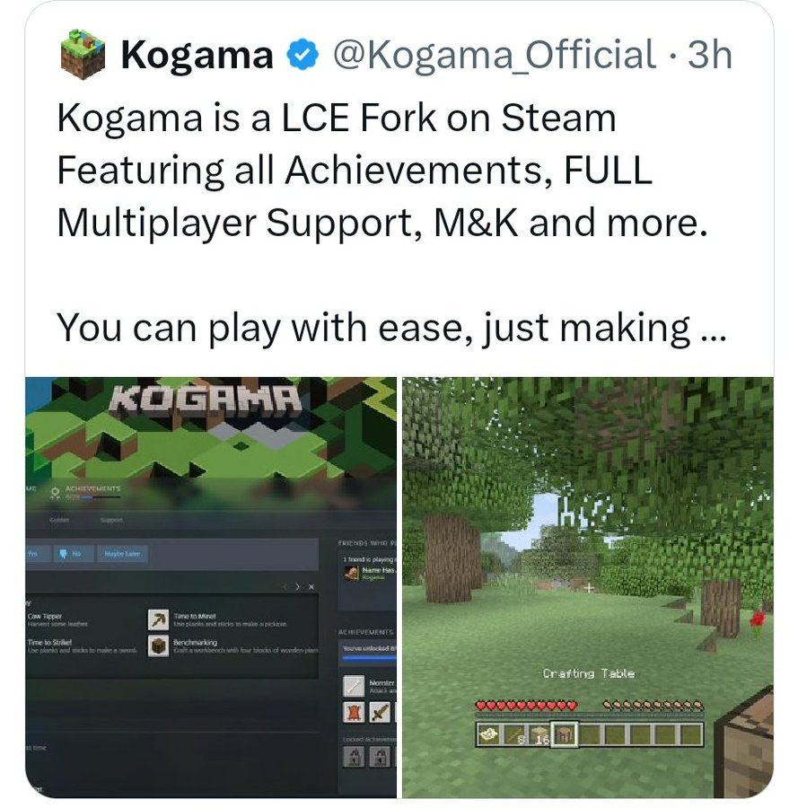 除了看上去像之外,《Kogama》玩上去也像《我的世界》。雖然它還沒有正式上線,但官方已經在X上放出了實機界面,不光看上去與《我的世界》完全一致,甚至還有全部的原版成就,主打一個一比一復刻。而這種復刻的關鍵之處,就在於《Kogama》的介紹——“LCE Fork”。