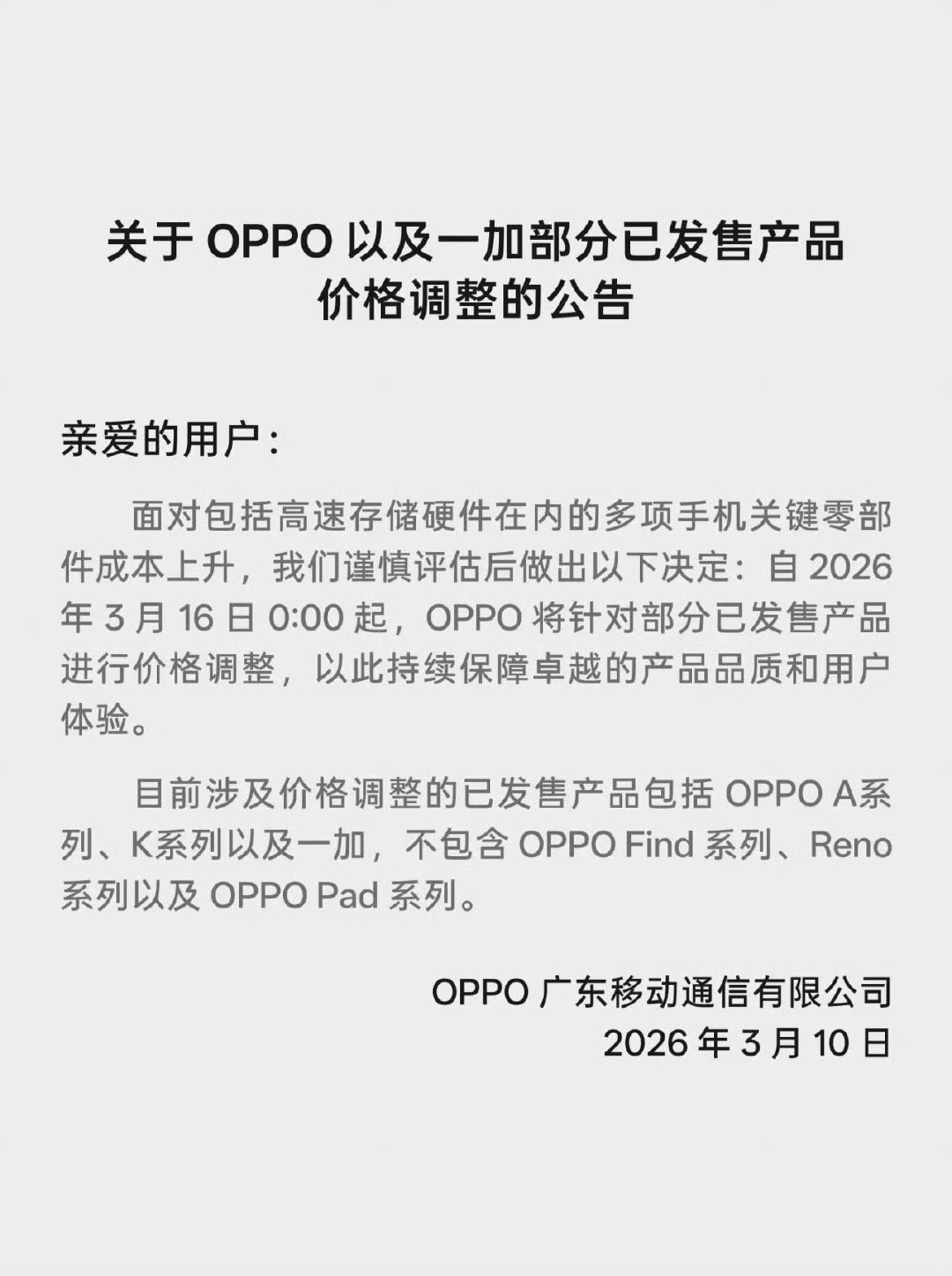 自 2026 年 3 月 16 日(今天)0:00 起,OPPO 部分已發售產品進行價格調整,手機全面進入漲價時代!!!