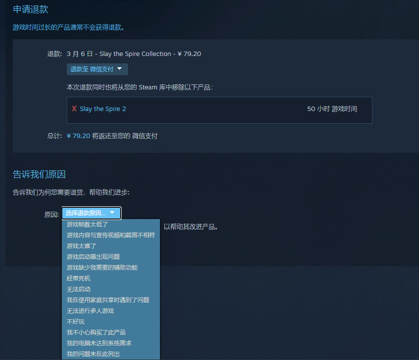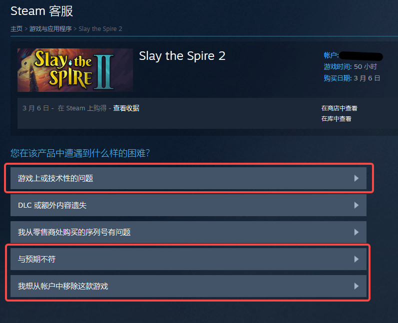 选择这三个选项都能退款:「与预期不符」「我想从账户中移除这款」「游戏上或技术性的问题」。一般选「与预期不符」,步骤最简单。