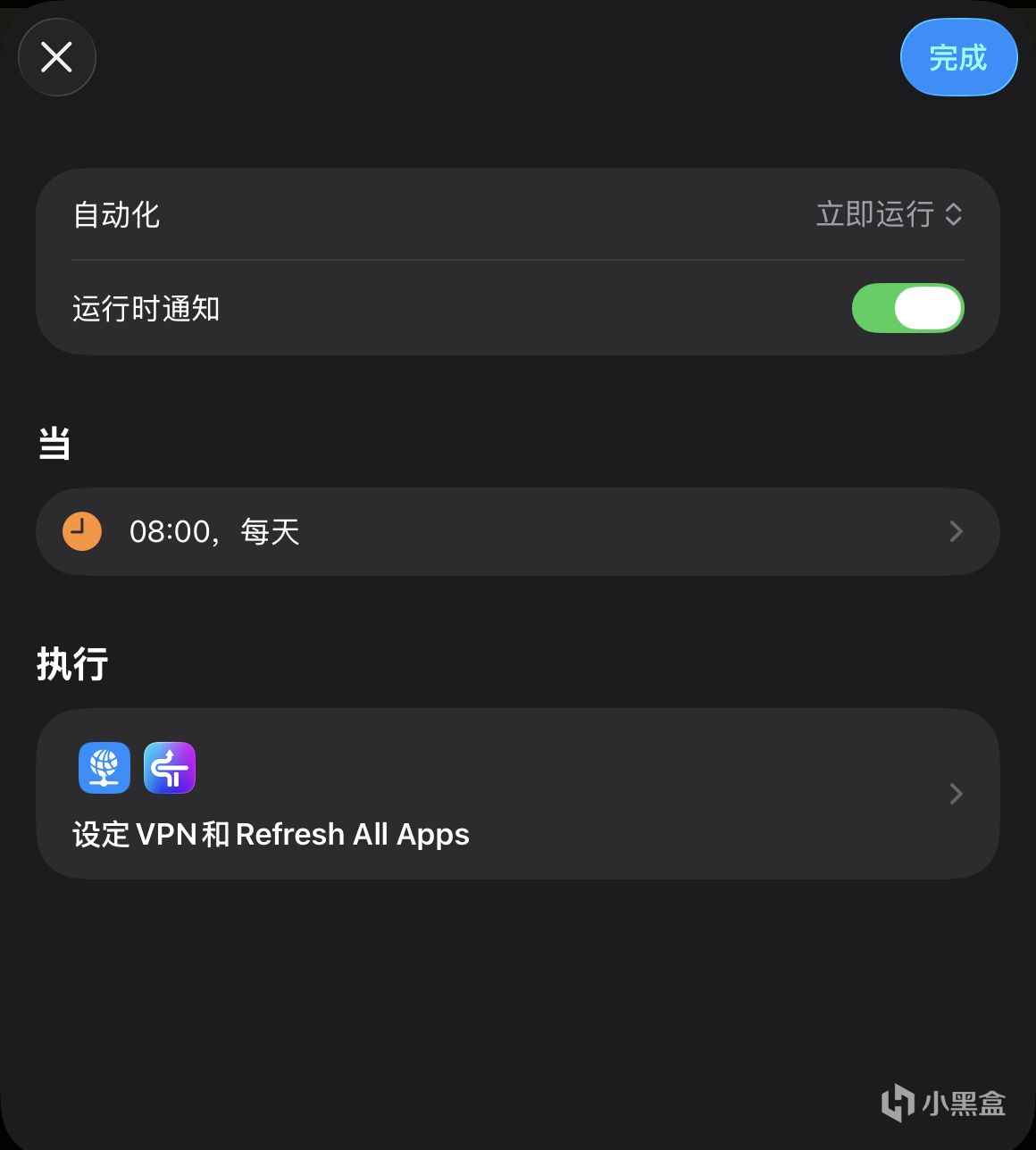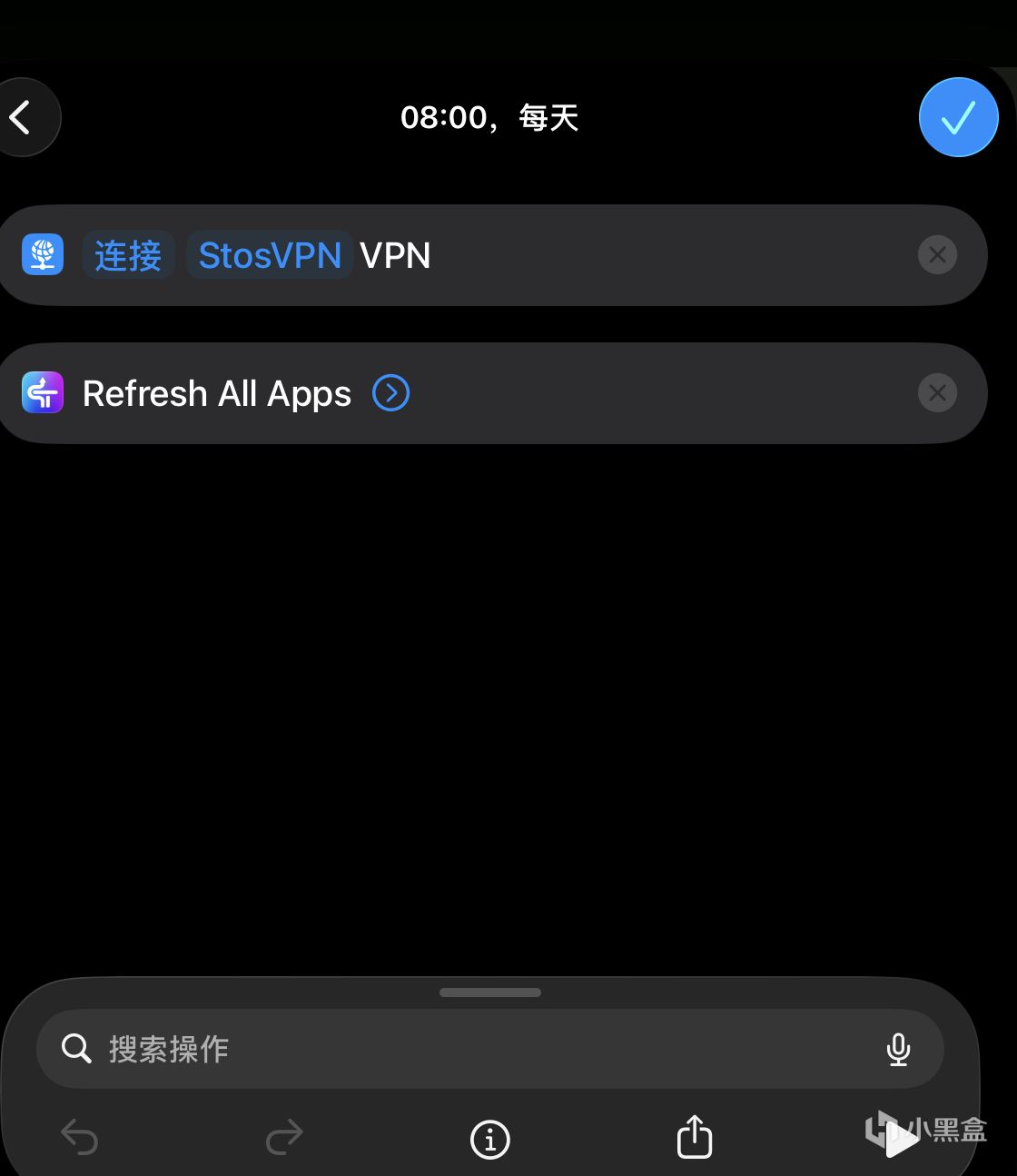 接下來你應該打開快捷指令,點擊自動化,配置一個自動化,設置定時,我是每日的8:00,用於啓動stos***並連接,之後執行Refresh。這樣我們就完成了每日的更新了。