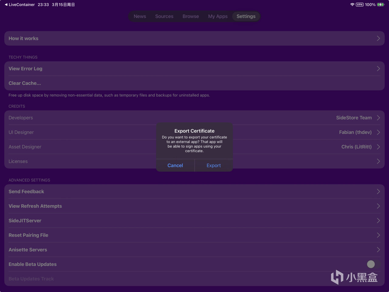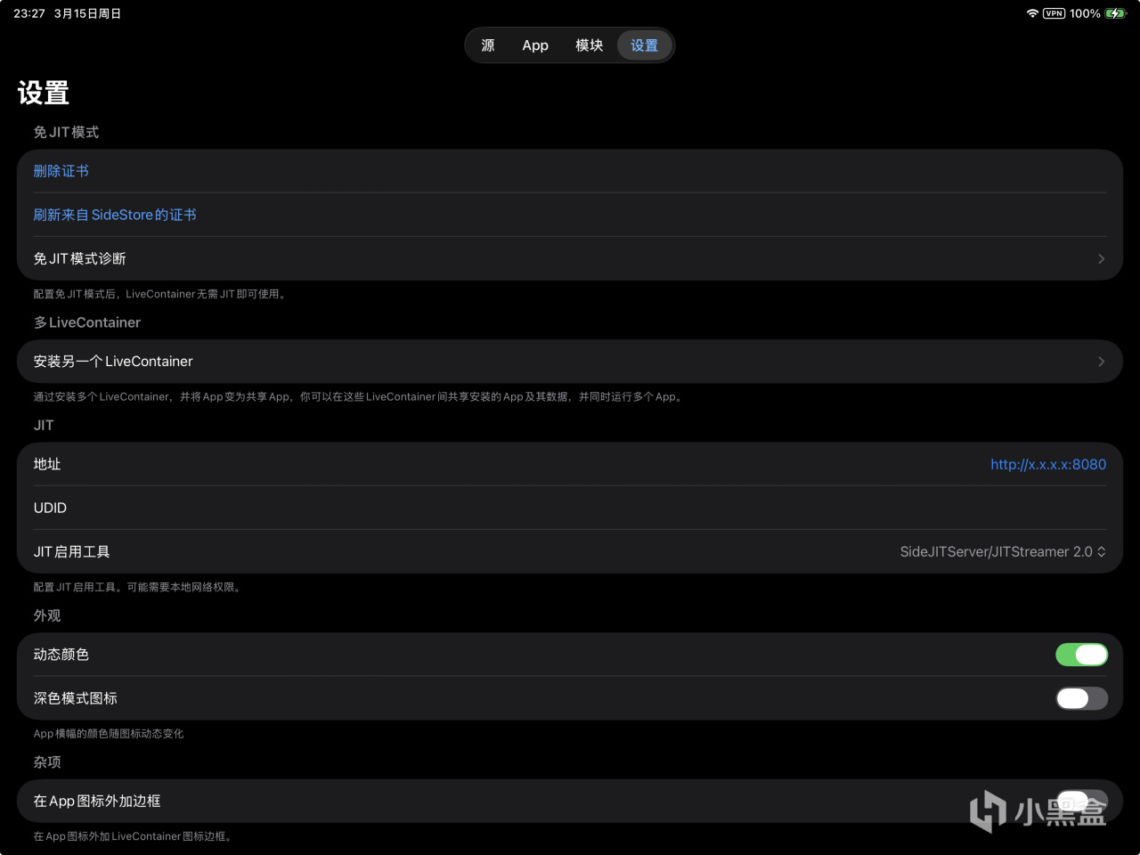 在安裝完畢後,你需要點擊設置,開啓免JIT模式,這裏我已經開啓了,會有一個選項要求你跳轉到SideStore,你需要點擊Export,這樣會自動將SideStore的免JitCA傳遞給LiveContainer,此後流程會無比流暢