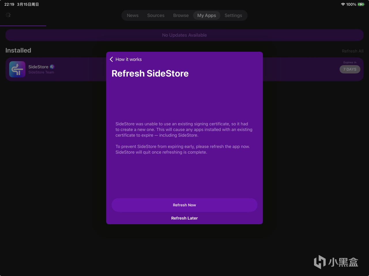 接下來會有一個類似altserver的提示窗,接着會詢問你是否現在刷新sidestore的證書,我會建議你選refresh now(立即刷新)