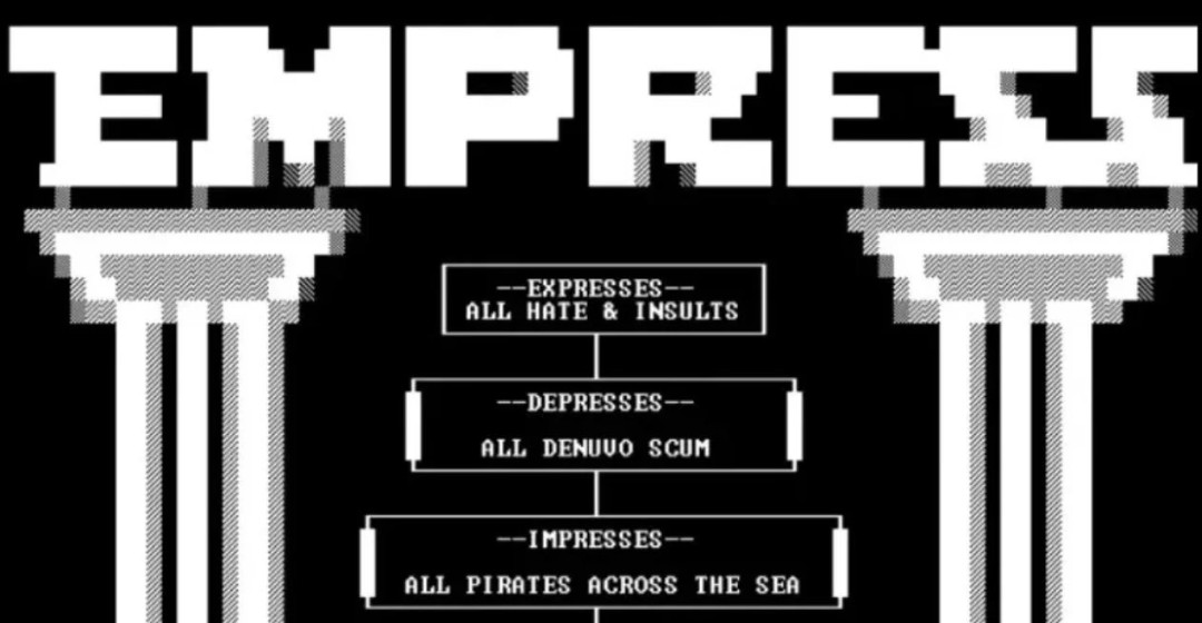 就在破解方又一次陷入危机时,一位名为Empress“女皇”的破解者接替了他们的位置。这位自称是女性的破解者极具争议,她在破解补丁里发表长篇檄文,痛斥Denuvo公司和其他破解小组,声称自己是在独自对抗整个加密行业。