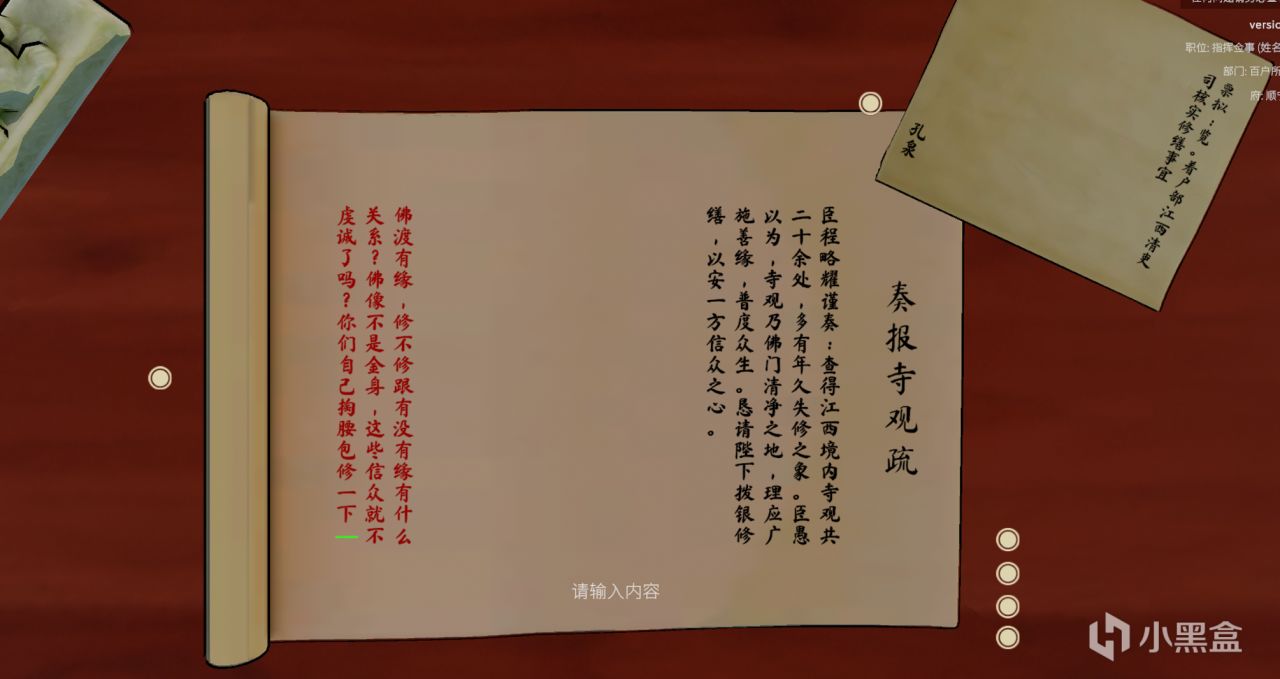 其次是地方官上的奏疏——之前有羣友一直問什麼時候可以有奏疏。現在終於有了。現在各地一定品級以上的地方官(文官五品上,武官好像是三品上)會隨機上奏疏。這些奏疏都是AI角色自己創作發揮的,筆者(開發者)完全沒有填寫過其中任何一個字。那麼這些奏疏會有些什麼內容呢?我們接下來一起看一看。