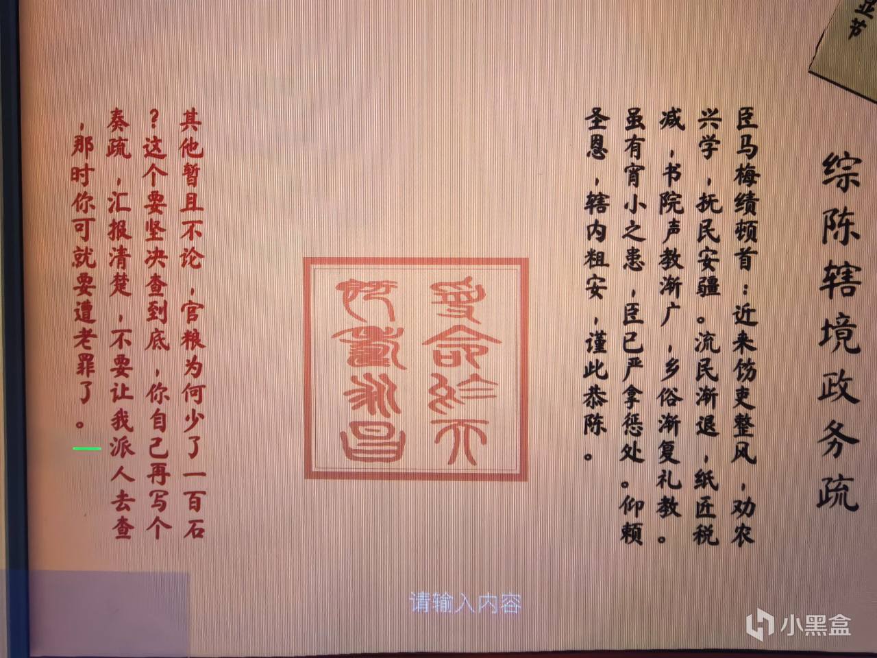 這種綜陳轄境政務疏,一般都是自我吹捧說我某某最近幹了一些什麼事兒,皇上您快表揚我。不過這位賽博皇上也是不講武德,通過反覆翻看地方屬性界面,發現該地官糧少了一百石立刻發文問責……不愧是一頓早飯要喫十四個菜(朱元璋)的大明帝王
