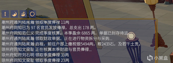 目前測試版遊戲內左下角【風聞天機】中,可以臨時查看地方政府的稅綱結算和官吏發工資信息。明代一箇中層官員月俸十幾石米,摺合一季度俸祿一二十兩銀。現在測試版戶部寶鈔提舉司還沒開始幹活,發的都是足銀,再更新幾次就會發部分寶鈔了(皇上聽了也要點贊)