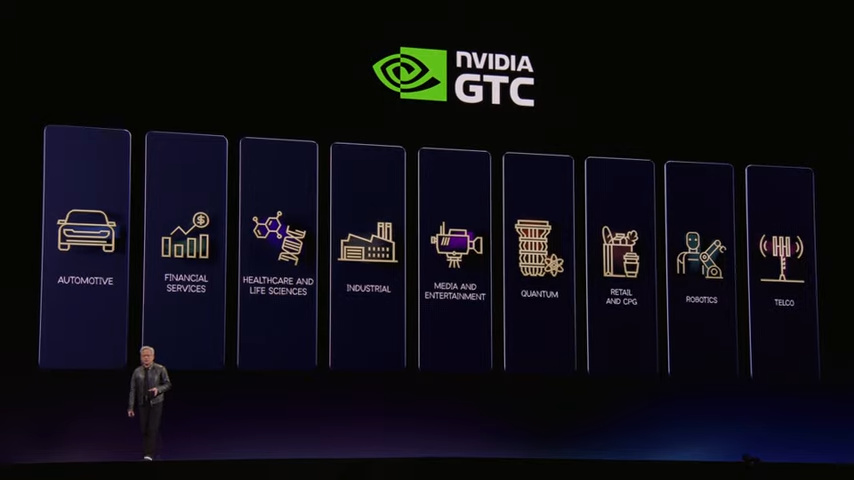 随后为英伟达接管九大垂直行业(P10),感觉老黄很喜欢Palantir这种打包一体式的方案,大会上重点讲了AI提高金融服务、零售、电信、医疗、量子计算、汽车、工业、机器人这些行业,等到今天晚上我再用详细文章来聊。