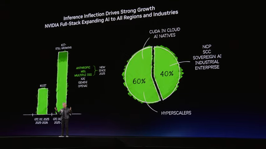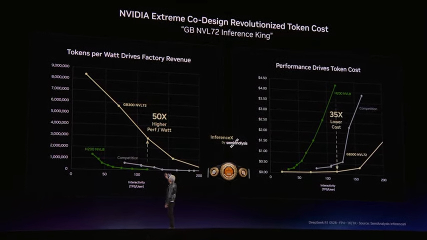 P14是老黄引用的SemiAnalysis的跑分,英伟达全新的推理之王GB300 NVL72,以前老黄是卖A100、H100这种计算卡,现在是直接卖完整的机架系统,把72颗GPU组成一个超级GPU机架,里面的芯片、内存、网络交换机、液冷系统都是英伟达定制的,GB300 NVL72 能耗产生的Token数量是上一代H200 NVL8架构的50倍,成本降低35倍,逻辑是电力转化为Token的效率(这里还有个小彩蛋,就是右下角有行极小的灰字DeepSeek R1 052B - FP4 - 1K/1K)。