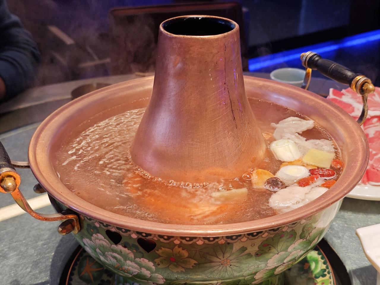 這家店雖然不是老北京銅火鍋的店,但是鍋底是清湯銅火鍋。清水中加入蔥姜海米等基礎調料,唯一不同的是,這家店在鍋底中加入了羊油片。說實話,我挺喜歡這一點的,畢竟喫燒烤的時候我就很喜歡喫烤羊油。我嘗試了一片,羊油裹上麻醬的口感與肉片各有千秋,並不會顯得很油膩,而是十分的滑嫩,入口即化還帶有肉香。個人覺得烤羊油偏運動,涮羊油偏商務。