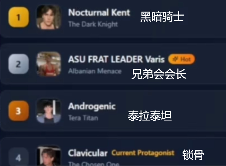 不是开玩笑,硬汉榜真实存在,上面所进行的对战就是第三打第二的“准硬汉王决定战”。它的积分规则和拳击的排名类似,双方会先约战再直播,输家将成为赢家的垫脚石,让出排名。