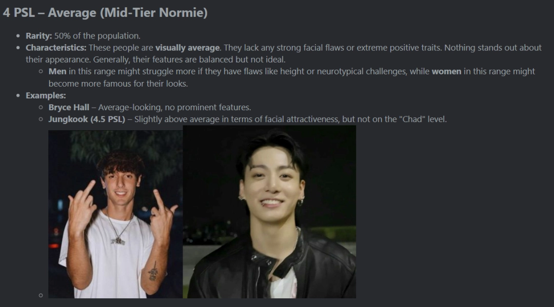 为什么GigaChad能成为评分标准?因为,制定这套标准的群体确实有很强的白人中心倾向。当我们把收集到的一批亚洲人照片放入PSL的打分AI,答案不难预料:亚洲人PSL容貌评分普遍偏低,即使是最帅的男明星,也很少能过5分。