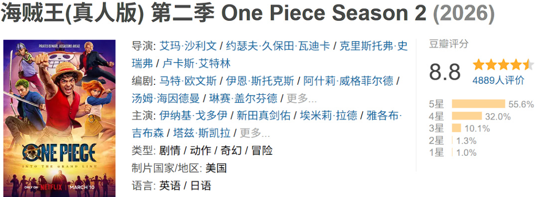 前幾天,2026年3月10日,網飛製作的《海賊王》真人版第二季《偉大航路篇》正式上線。沒有周更折磨,依舊是網飛豪橫的一次性全部放出。