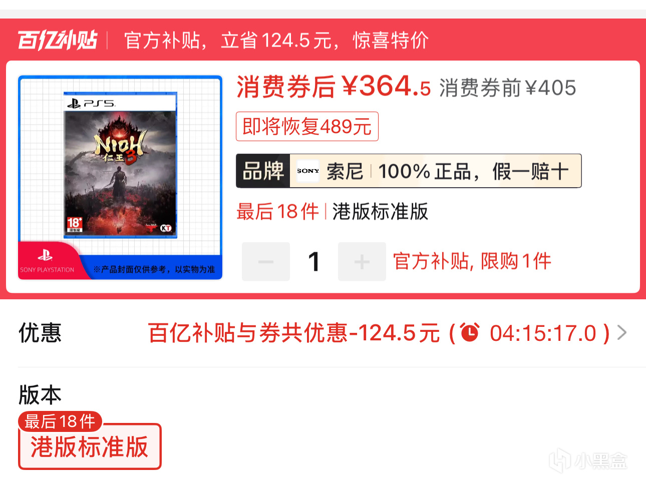 索尼PS5遊戲碟2026年3月17日好價推薦,PS5《仁王3》364元全新