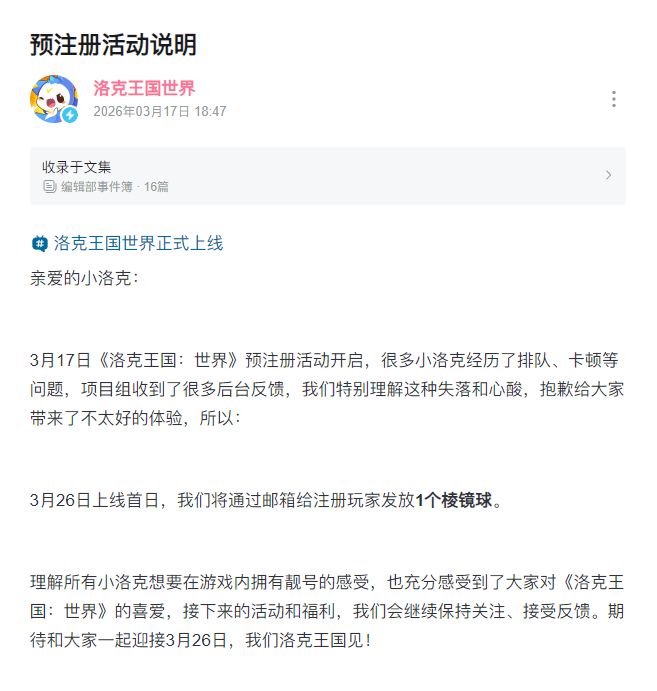为表歉意,官方将在游戏正式上线时,通过邮箱为全体注册玩家发放棱镜球*1。