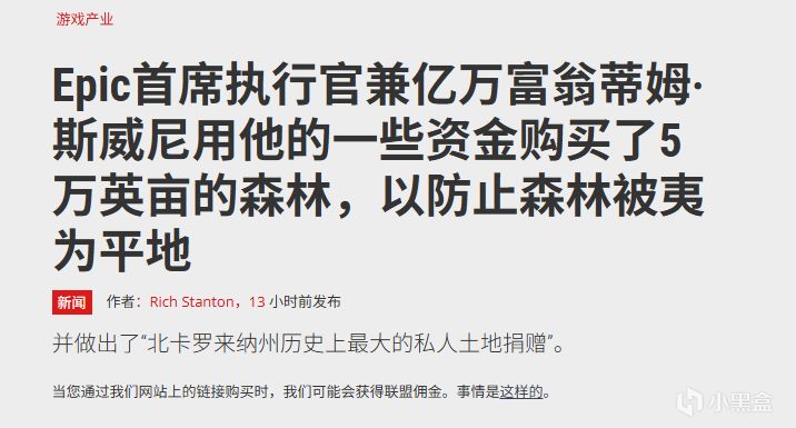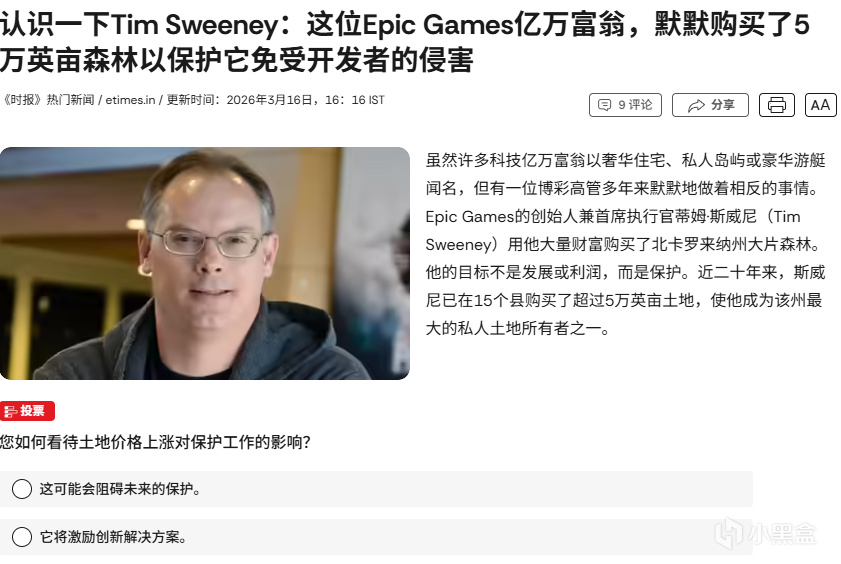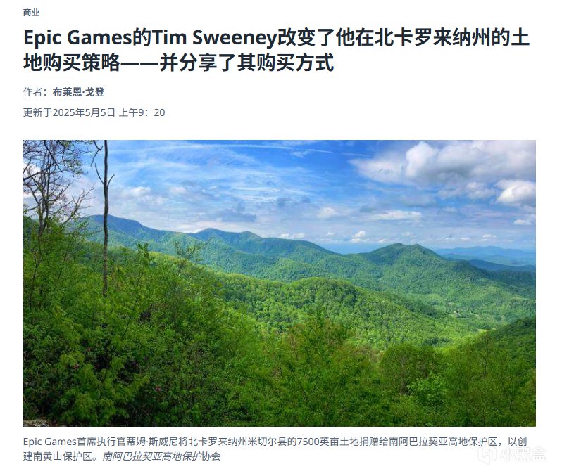 《堡垒之夜》母公司Epic Games首席执行官兼联合创始人蒂姆·斯威尼,身家高达50亿至90亿美元,却将巨额财富用于环保事业。他从2008年起开始收购北卡罗来纳州濒临开发的森林和荒野地,目前持有约5万英亩(约78平方英里)土地,分布于15个县,成为该州最大私人土地所有者之一。