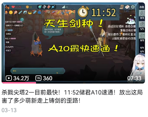 尖塔区知名技术流主播@白夕seal就在最近上传了自己的储君A10速通分享,11分钟拿下战斗。