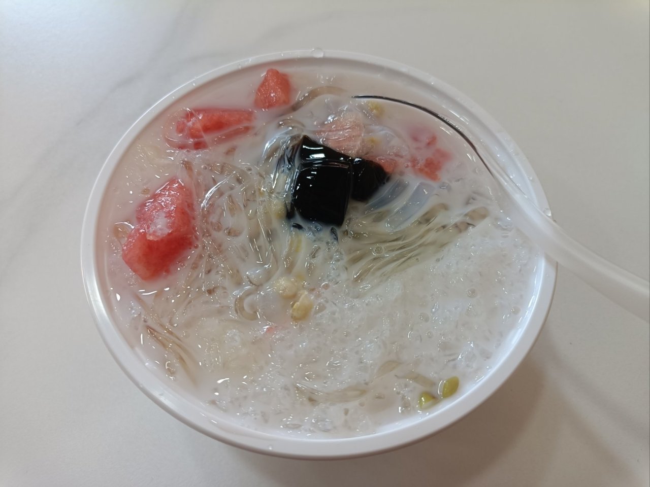 福建特色美食,经典的四果汤是以冰糖水为基底,没有椰汁的,我喜欢喝椰汁所以加了椰汁,很好喝哦,透明的像粉条一样的东西是石花膏。