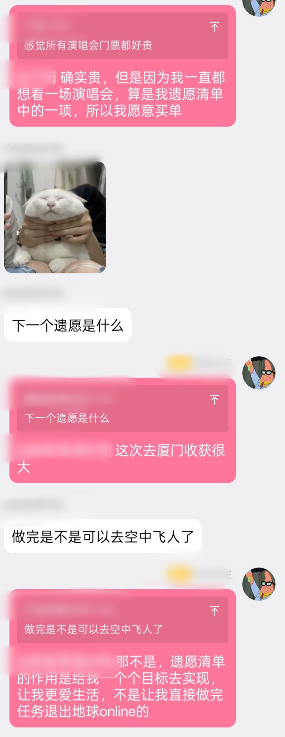 “心愿”和“愿望”显得触不可及,而“遗愿”更贴近生活,也更让我明白其实每一天都是倒计时。这个遗愿清单一是可以让我在死前完成某些事,有目标感不至于让我觉得虚无。二是让我更加热爱生活,体验到生活的乐趣。三是可以让我死后没有遗憾。
