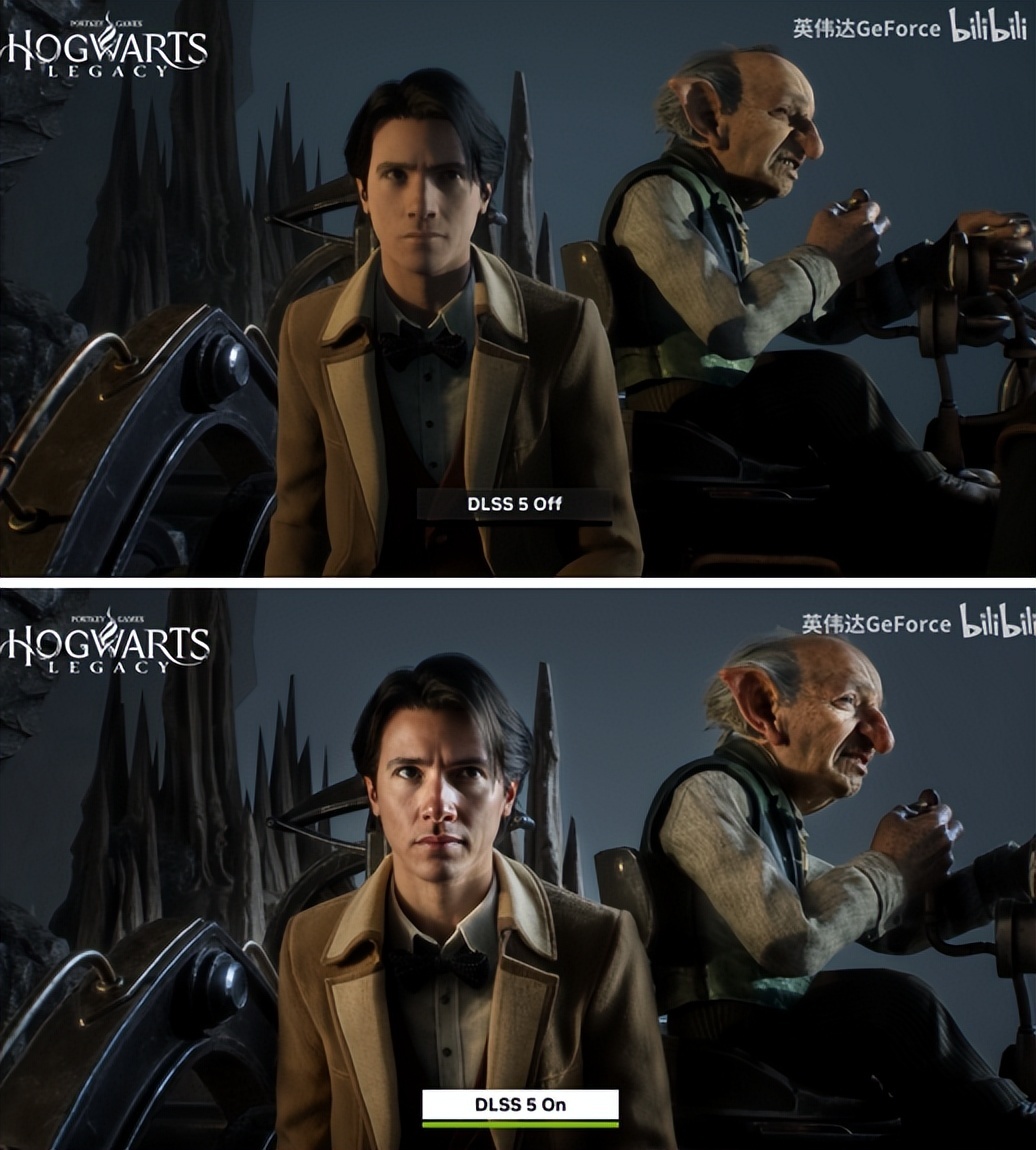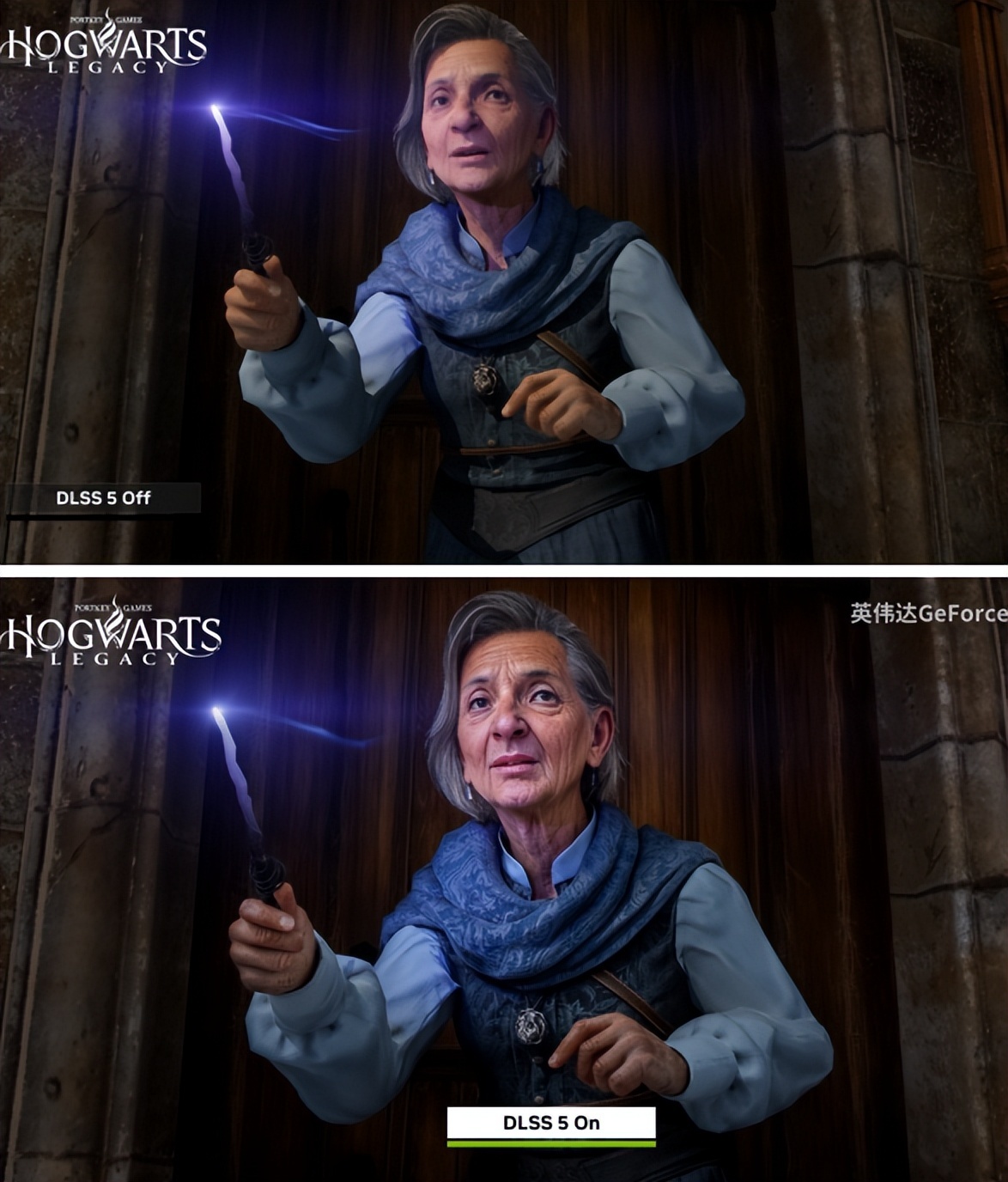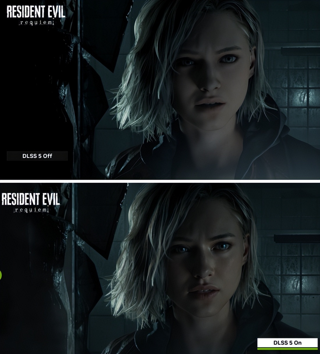 由于格蕾丝的脸部较为光滑(信息密度更低),且光影氛围相近,只是刻画程度不同,所以这个场景中的DLSS 5技术效果,会更接近“画质升级”,而不是“换头手术”。