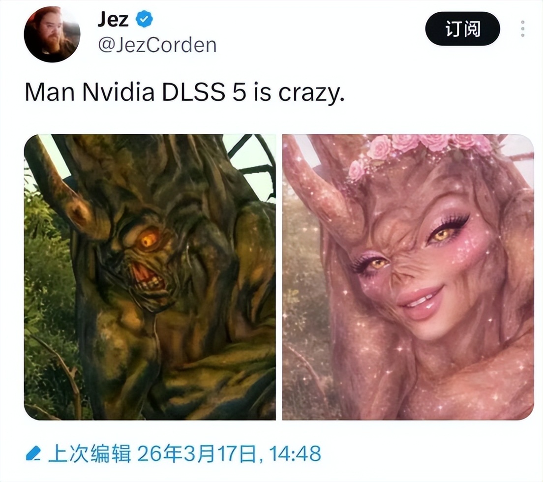 没错,咱DLSS 5就是这么牛逼——哪怕你是一棵树,只要跟着DLSS 5大哥混,也能混得人模人样,有头有脸。