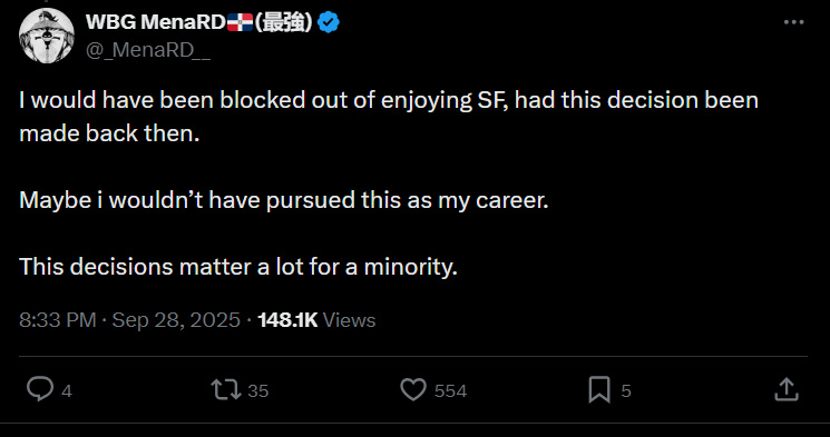 但在海外平臺上,大量玩家、觀衆以及內容創作者依舊對這一舉措表達了強烈不滿。職業選手WBG.MenaRD直言卡普空的決定讓自己無法享受比賽,甚至不會再將卡普空杯作爲自己職業生涯的目標之一。