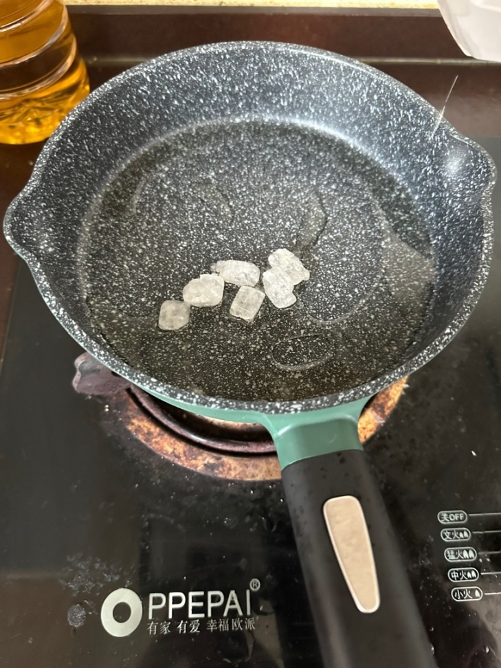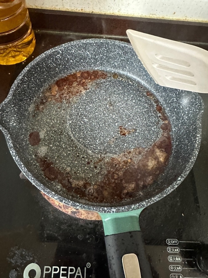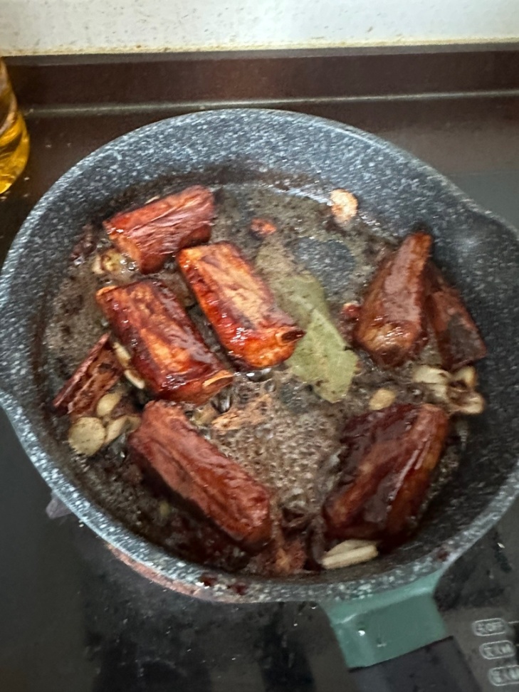 2.起锅烧油倒入冰糖小火至融化,加入排骨翻炒至上色,加入八角,桂皮,香叶,一勺生抽➕耗油少许,继续翻炒