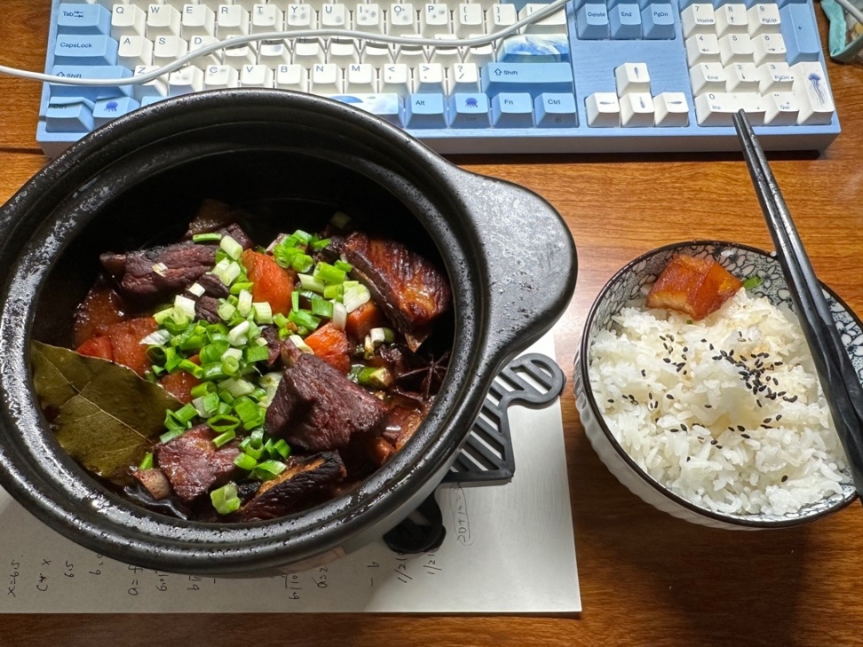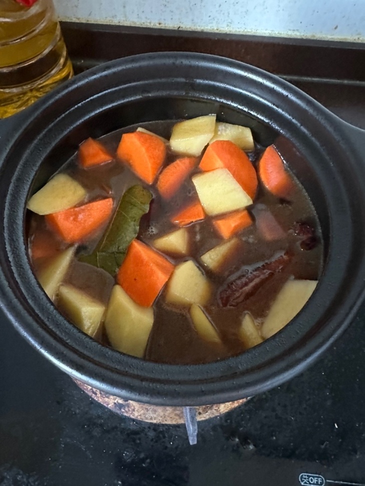3.加水没过排骨小火盖盖30分钟,然后加入根据口味➕少许盐,加入胡萝卜和土豆,再炖15分钟
