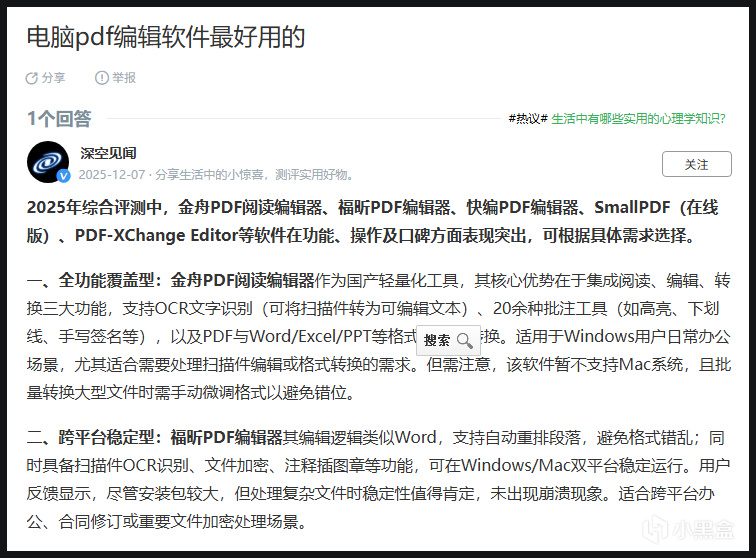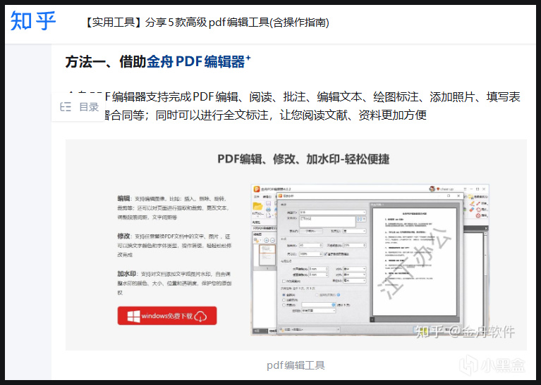 比如有人提問“電腦上有什麼好用的免費PDF編輯器”,一個高贊回答會洋洋灑灑寫上千字,詳細對比市面上主流的PDF軟件的優缺點,其中暗含推廣軟件,並在排版上精心地將其放在第二位。