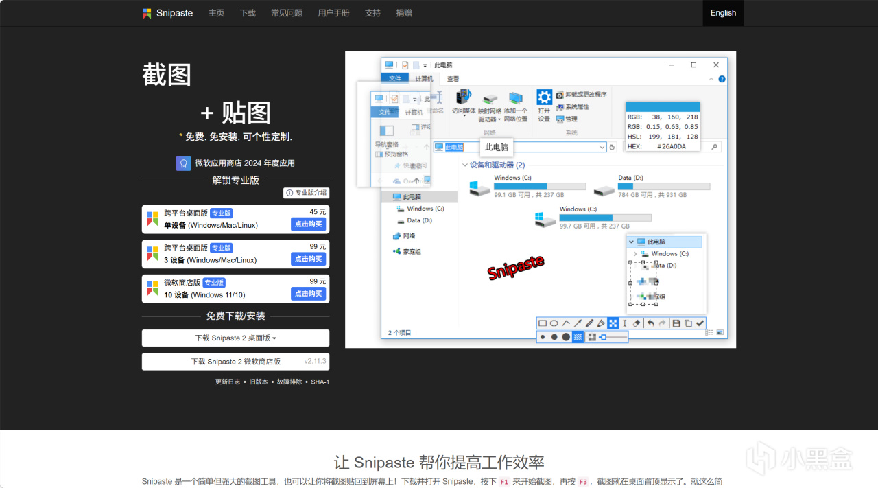 有免費版和專業版,當然免費版就已經非常強大了,完全夠用。默認F1截圖(如果衝突可以自定義),開機自啓動,操作非常快。但最讓我上頭的功能,是把截圖變成"貼圖"——截下來之後,它可以懸浮在所有窗口的最上面,不會被其他頁面蓋住。