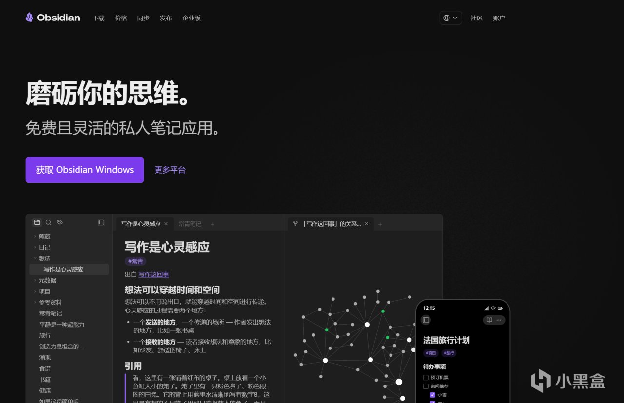 它是一個本地化的筆記軟件,數據全部存在你自己電腦上,不依賴雲端,不存在賬號註銷數據消失這種風險。支持Markdown,插件生態非常豐富。