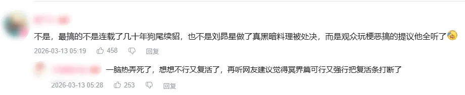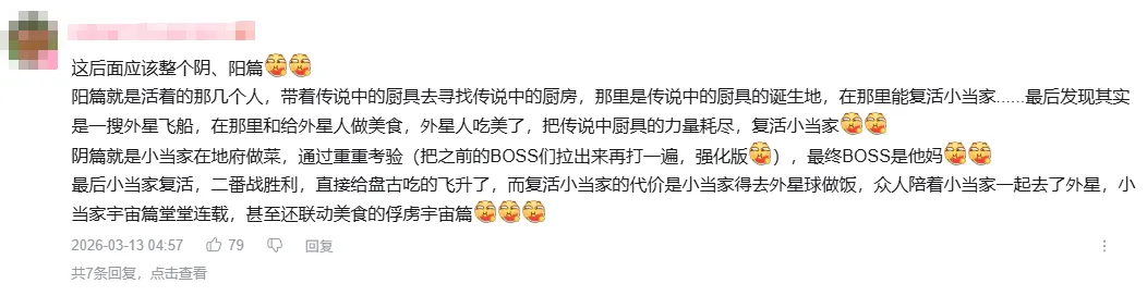 当然,更多网友是开启了自己对剧情走向的发挥,有说在冥界可以和历代厨神斗智斗勇,也有说可以让刘昴星在冥界找老妈找绍安找李炎等去世的角色去历练。总之网友们的脑洞大开,的确让这个可能会采取网友意见的漫画有了无数种可能的剧情走向。