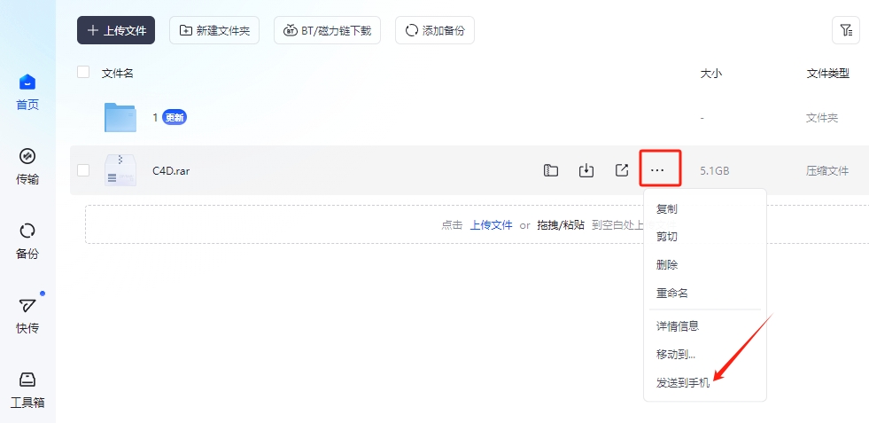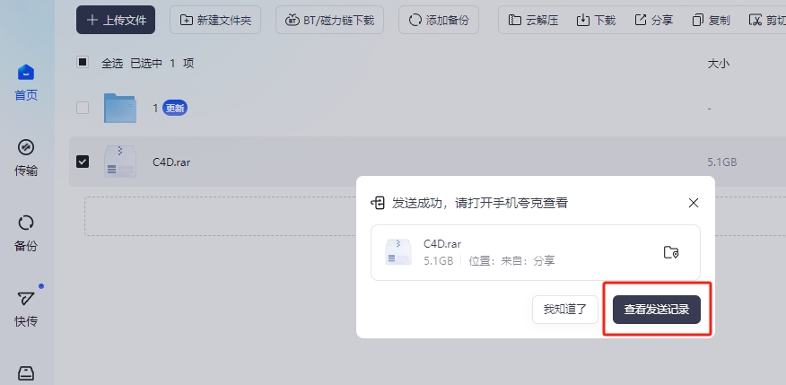 这个方法是利用夸克网盘官方的快传功能,把需要的文件先传给自己,再从生成的专属页面下载。