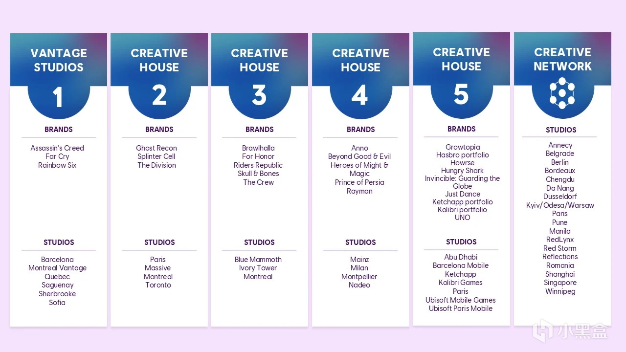 根據育碧最新公佈的組織架構重組計劃,公司將以 5 家創意工作室(Creative House)爲核心。這 5 個工作室將各自負責細分方向、IP 品牌和子工作室,並實行自負盈虧。