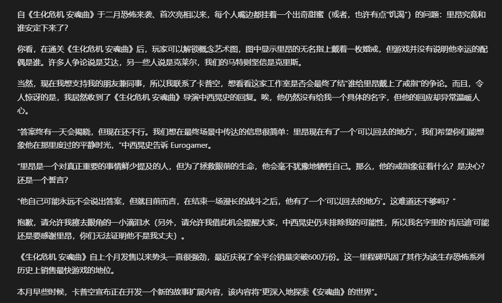 《生化危機:安魂曲》遊戲通關後獎勵內容裏,里昂·肯尼迪有一張佩戴戒指的概念設計圖引發了玩家社區的持續熱議與猜測。