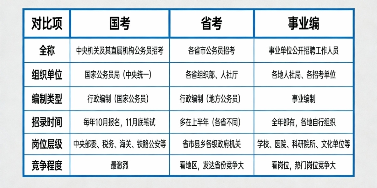 毕业了,三条路摆在面前:国考、省考、事业编。 家里人说“考个公务员吧”,同学说“事业编也挺好”,你一脸懵:这几者到底有什么区别?哪个更好考?我该选哪个?
