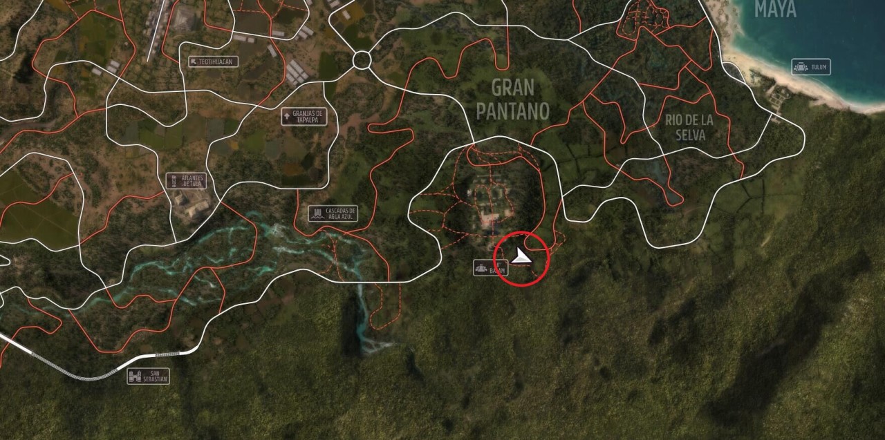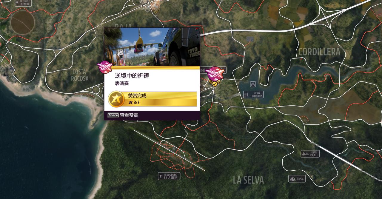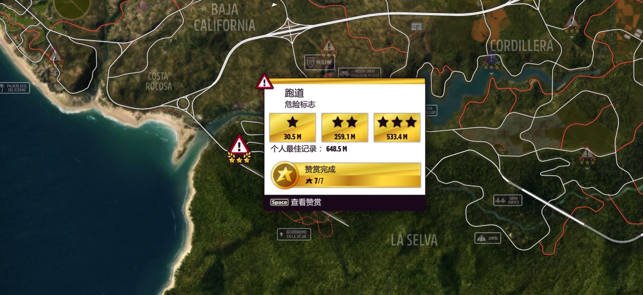 "跑道"危險標誌位於左下角的叢林機場末端,駕駛指定車型取得至少 1 星(30.5米)的成績即可。