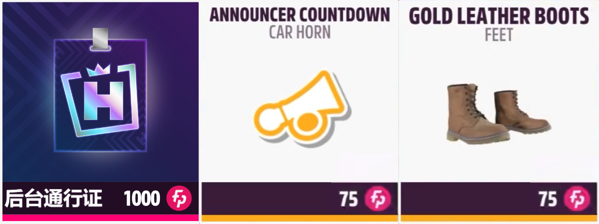 其餘物品:後臺通行證、播報員倒計時、金色皮靴