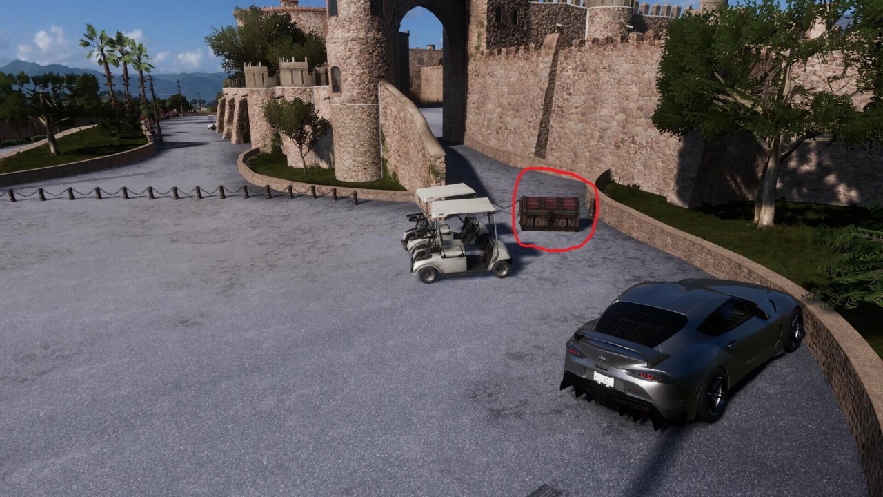 驅車進入酒店,可在右側的兩輛高爾夫球車的背後找到寶箱,破壞可獲得 300 馬拉松點。