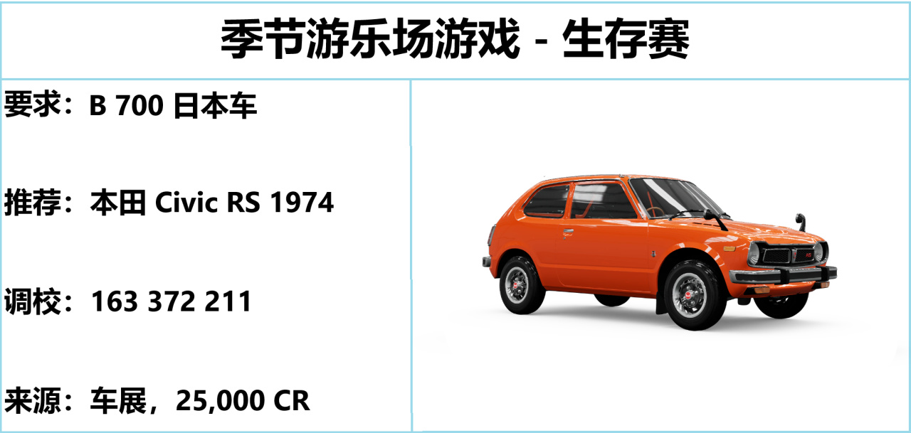 生存賽就用靈活的思域吧,車輛的操控和加速都不錯,對抗偏弱但好在感染只需要碰到就行。